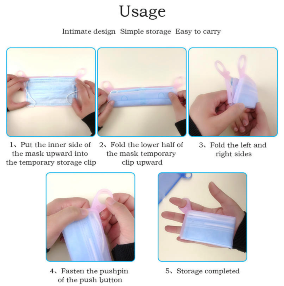 Portable Face Mask Storage Folder Reusable Food Grade Silicone Organizer for Disposable MaskFeature:1. Food grade silica gel, reusable, safe and environmental protection;2. Convenient design, less contact, convenient storage, scientific epidemic prevention;3. It can be boiled and sterilized. It is made of food grade silica gel, resistant to high temperature of 230 ℃, wear-resistant, durable and flexible.Usage:1. Put the inner side of the mask upward into the folder;2. Fold up the lower half of the folder;3. Fold the left and right sides together;4. Fasten the buckle;5. Storage complete.Note:1. There may be slight size deviations due to manual measurement, different measuring methods and tools.2. The picture may not reflect the actual color of the item because of different photographing light, angle and display monitor.