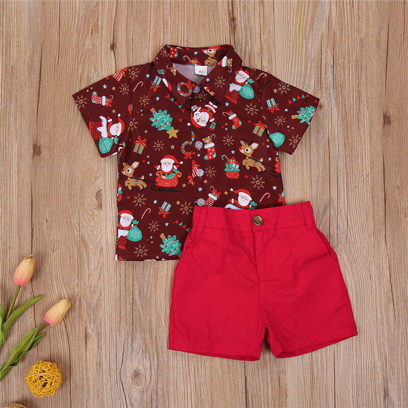 Summer Children’s 2-piece Suit, Solid Color Short Pants, Christmas Themed Print Polo Neck Short Sleeve Casual Suit