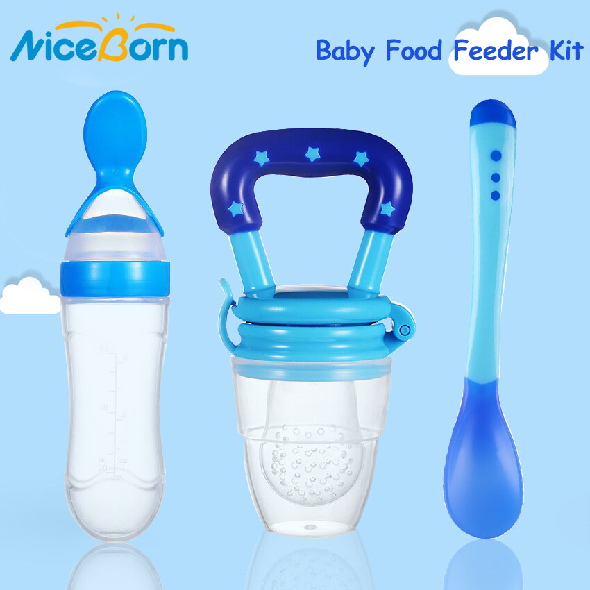 NiceBorn 3PCS Baby Food Feeder Kit Squeeze Feeding Bottle with Spoon Baby Bite Pacifier Temperature Spoon Fruit Vegetable Feeder Squeezing Food Bottles Rice Paste Juice Feeder Infant Fruit Feeder Paci