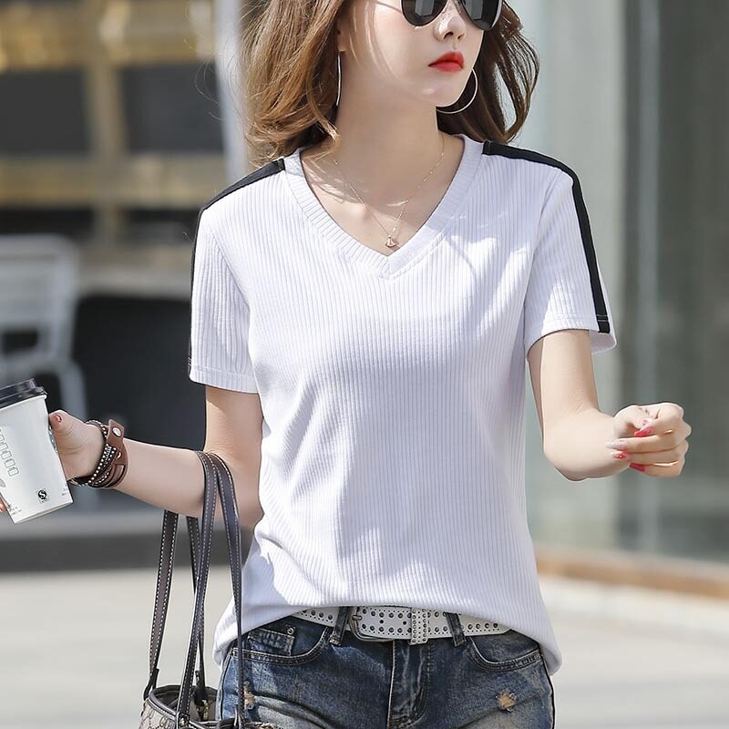 Summer Black V-neck Short-sleeved T Shirt Women's Tops 2021 New Style Wild Loose T-Shirts Slim Beautiful Blouse Cotton T-shirt Korean Style Clothes for Women Clothing