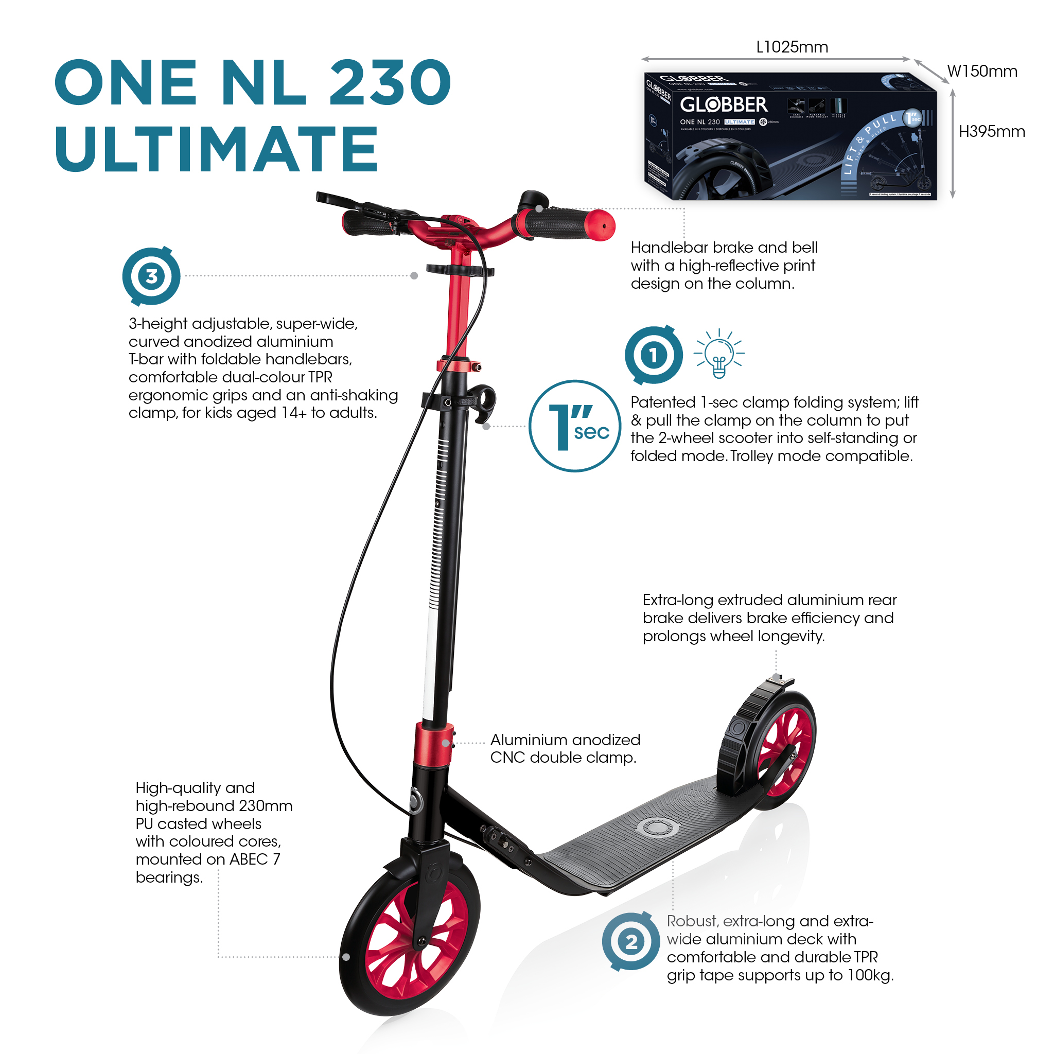 Globber One NL230 Ultimate Big Wheels Adult Kick Scooter with Handbrake & Bell