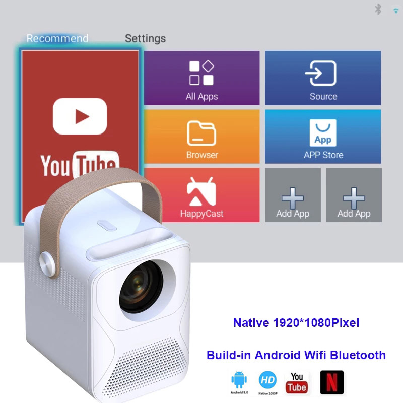 • Resolution 1920x1080p physical resolution • LED projector/built-in battery (optional). •Android 9.0 OS. Pre-installed NETFLIX, YOUTUBE •Support wireless sync display with Android phone /iphone •Support WiFi & Bluetooth function•Support vertical +-40°,Support Horizontal+-40° • Hermetically sealed optical engine engine