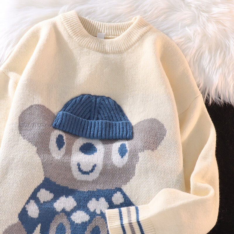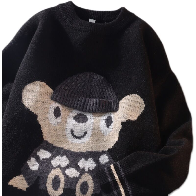 Autumn and Winter Sweater Men's Thickened Loose Trendy Ins Hong Kong Style Cartoon Printed Sweater Hip Hop Lazy Casual Clothes