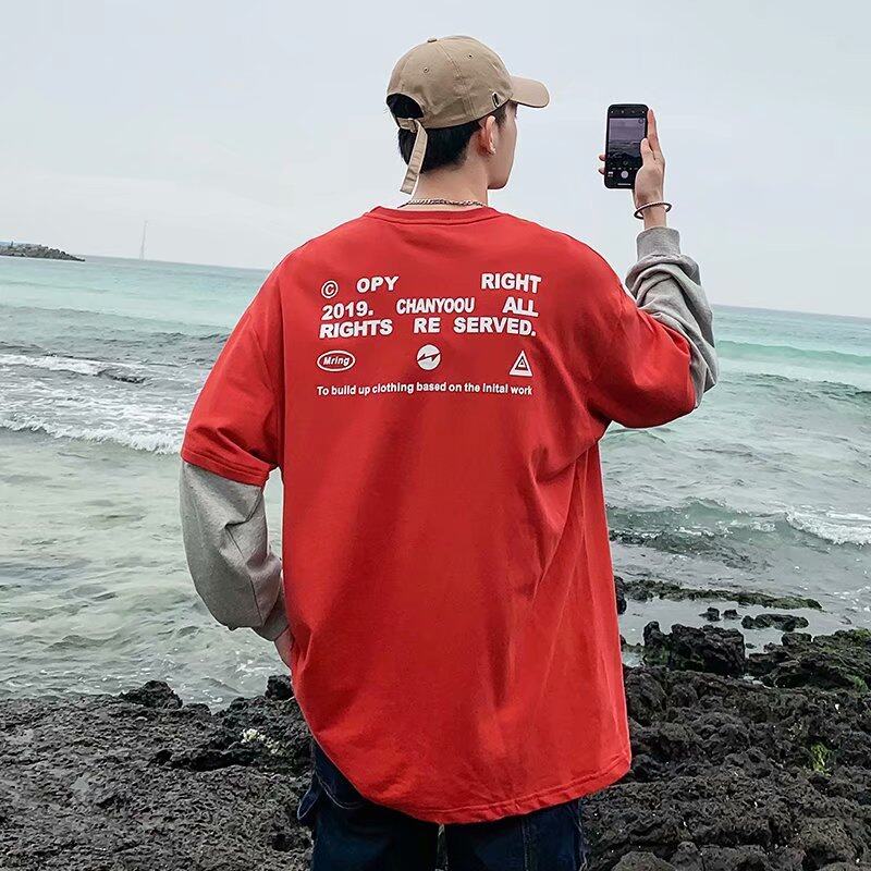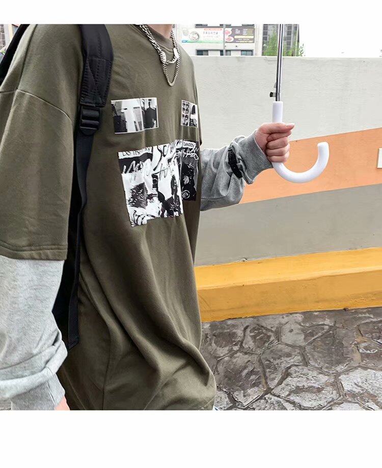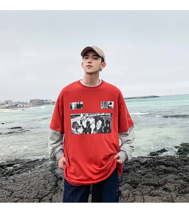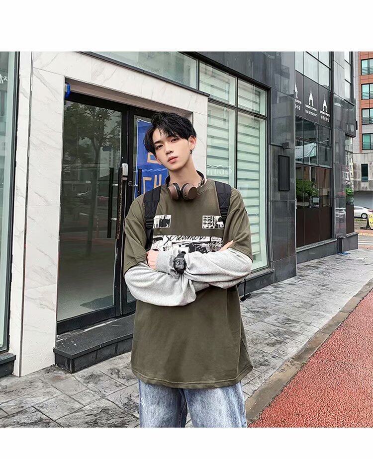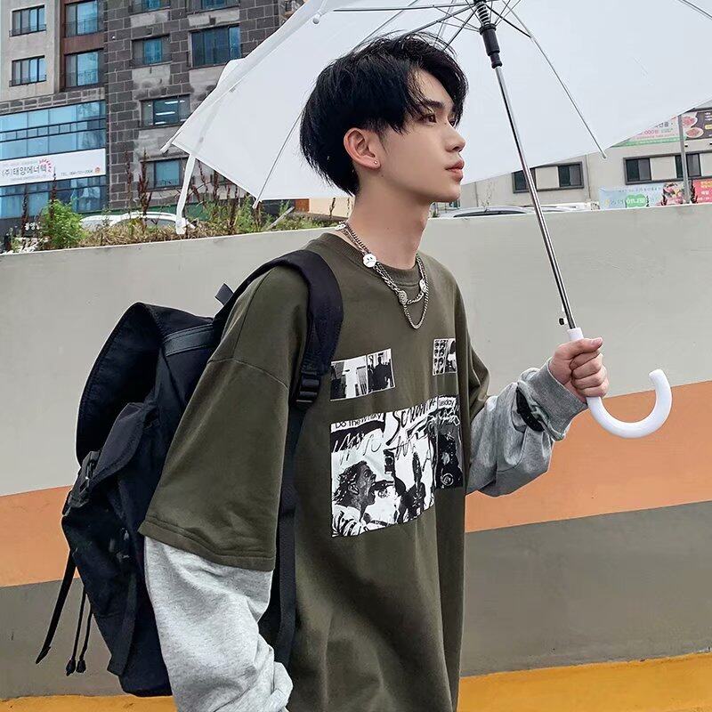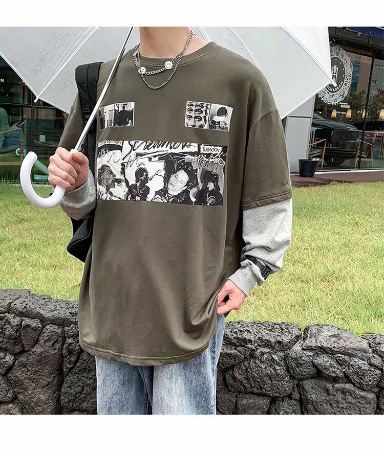 t shirt Men Long Sleeve 2 in 1 Korean Style New Oversize Graphic Print Tee Fashion Tops Loose Casual t-shirt