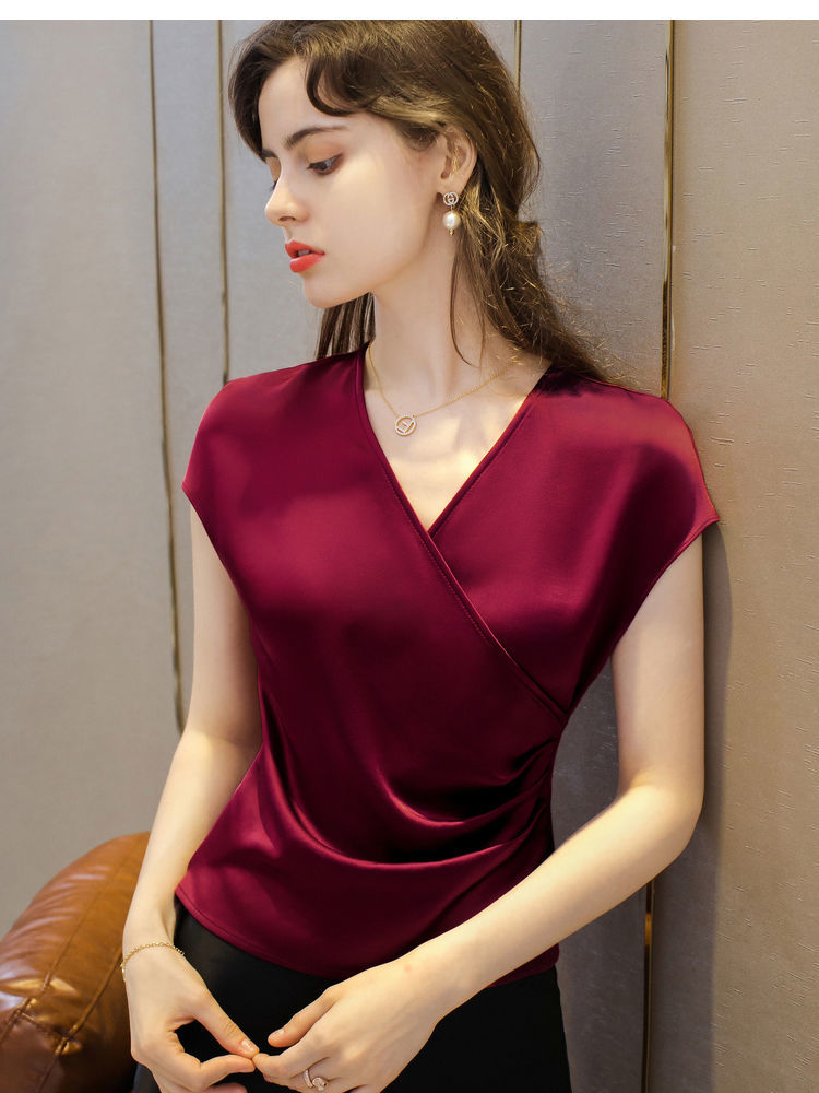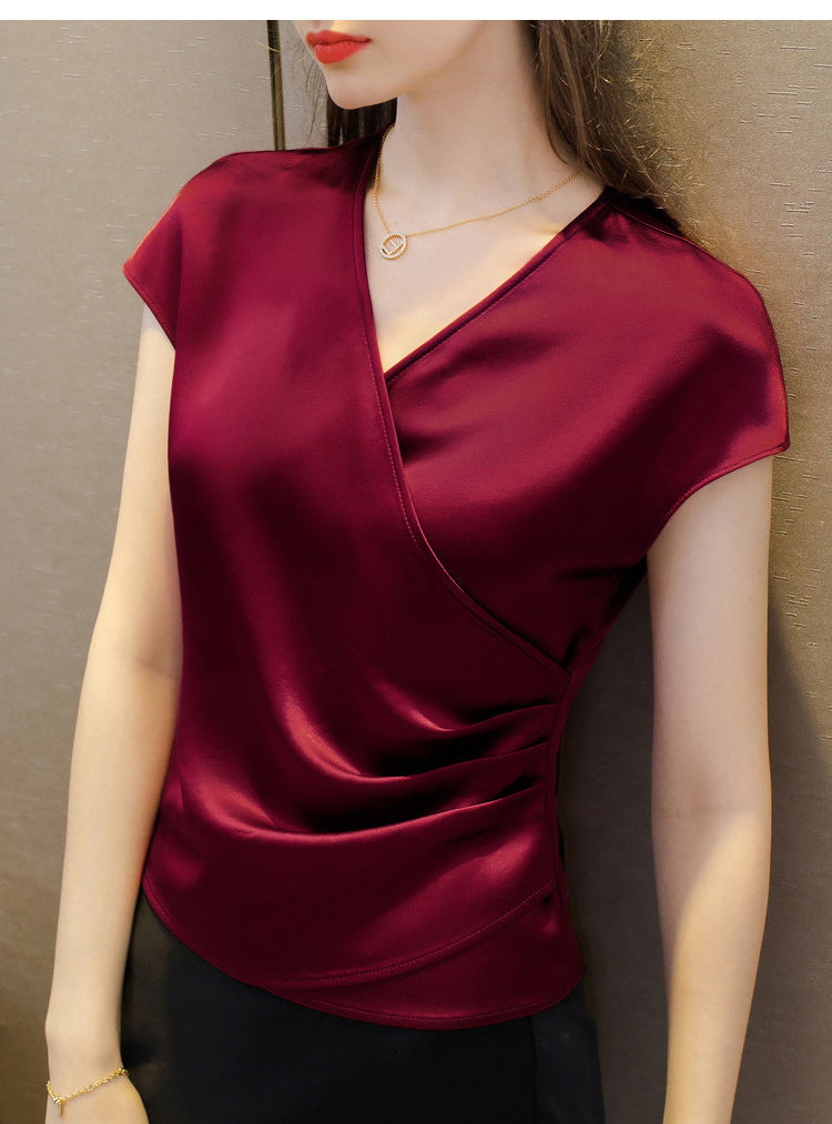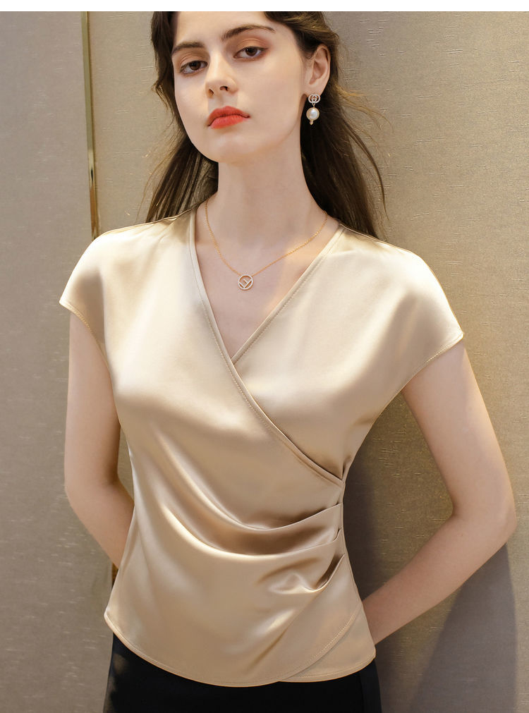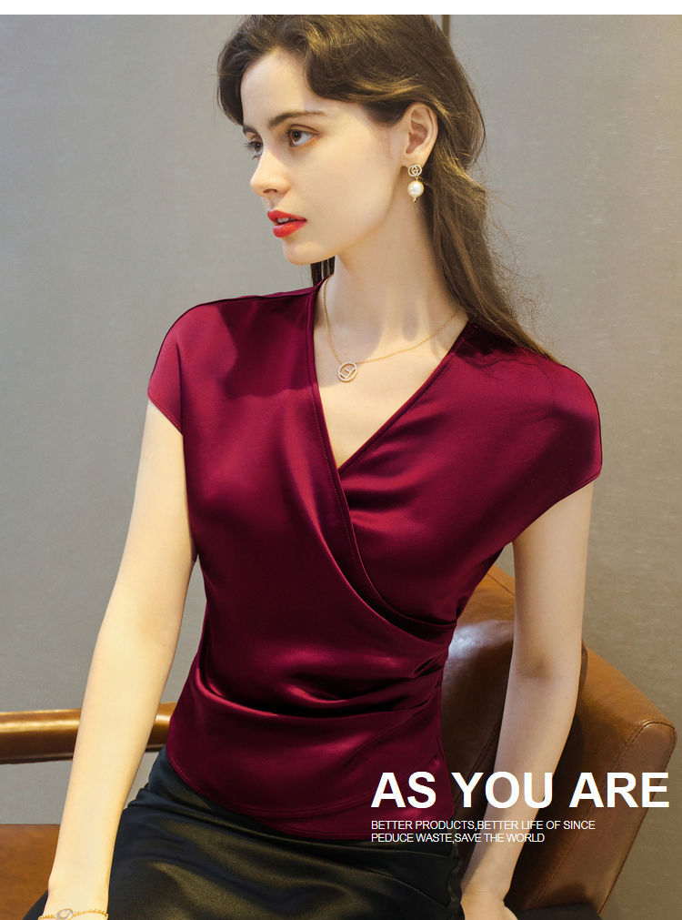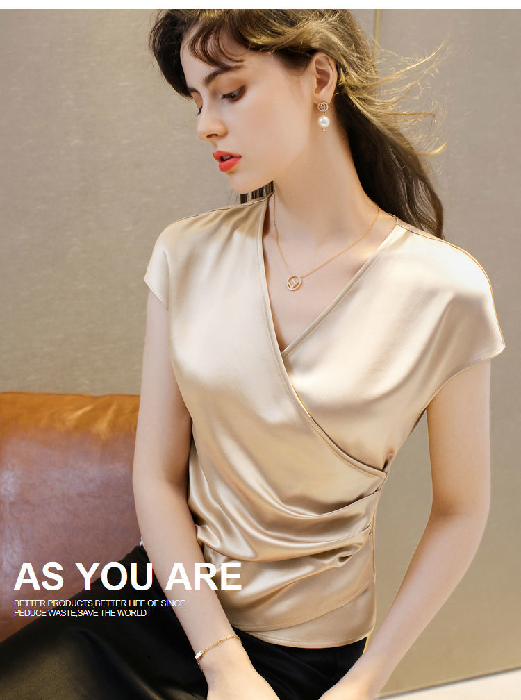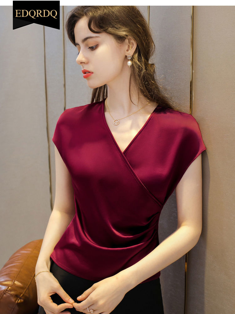 EDQRDQ Women's Casual Satin Silk Cross V Neck Wrap Tee Ruched Fold Shirt Elegant bishop Sleeve Blouse