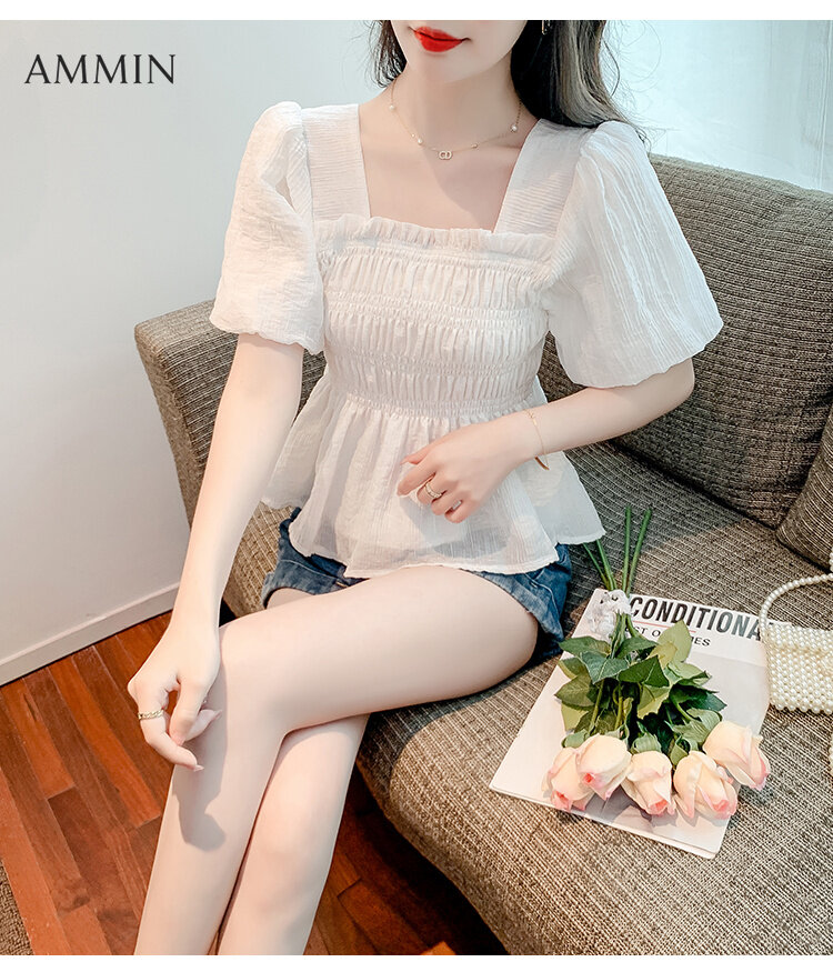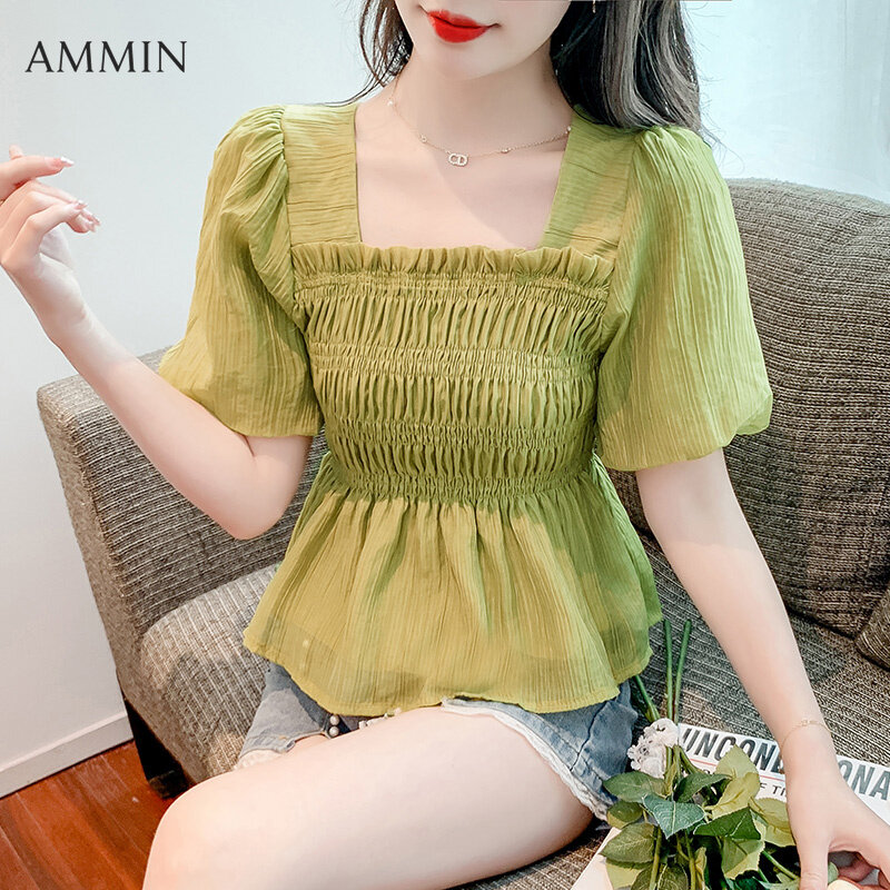 AMMIN 2022 summer new retro temperament square neck puff sleeve chiffon shirt Korean style fashion temperament waist thin chiffon Top doll shirt casual blouse For women