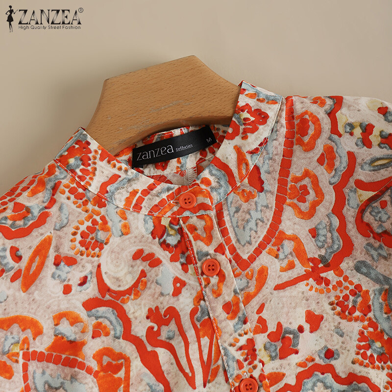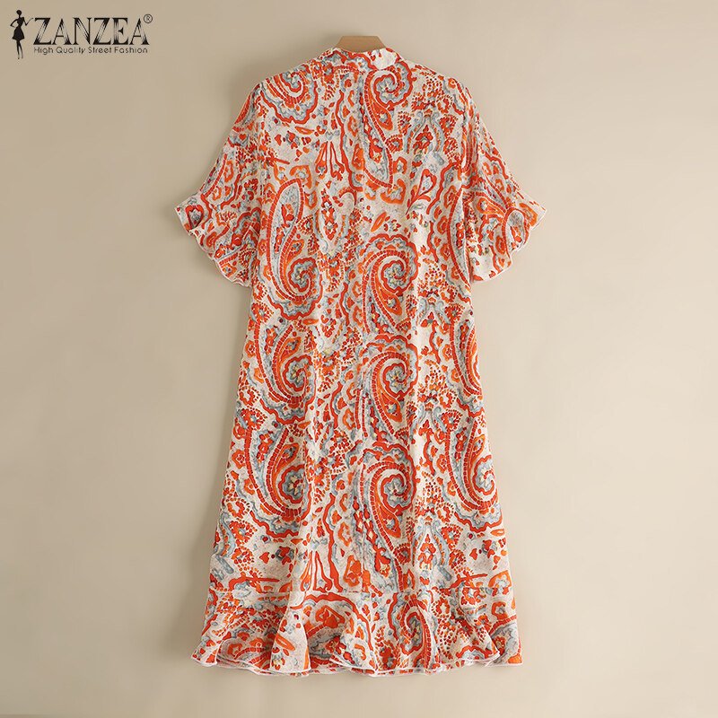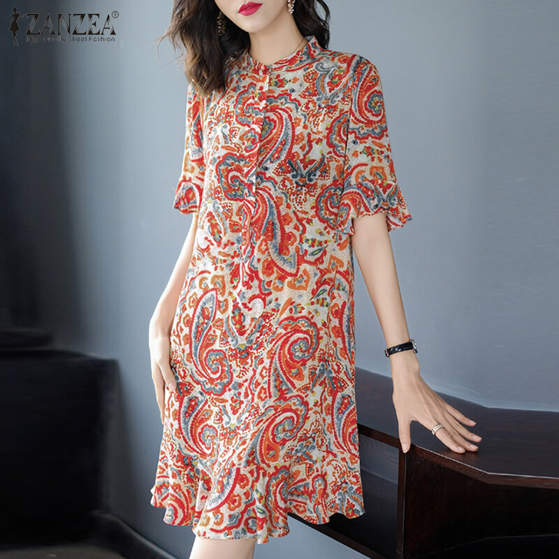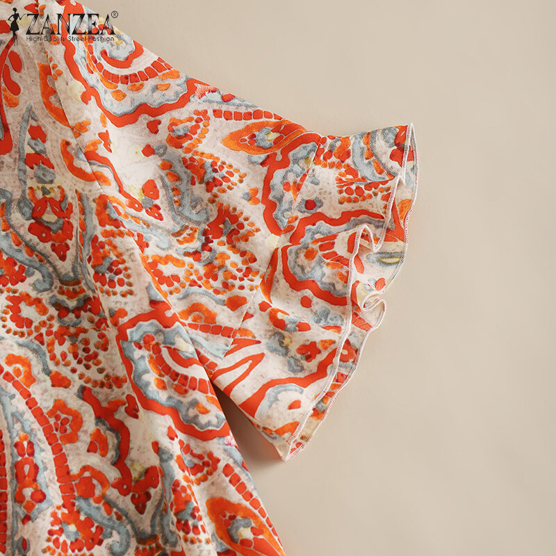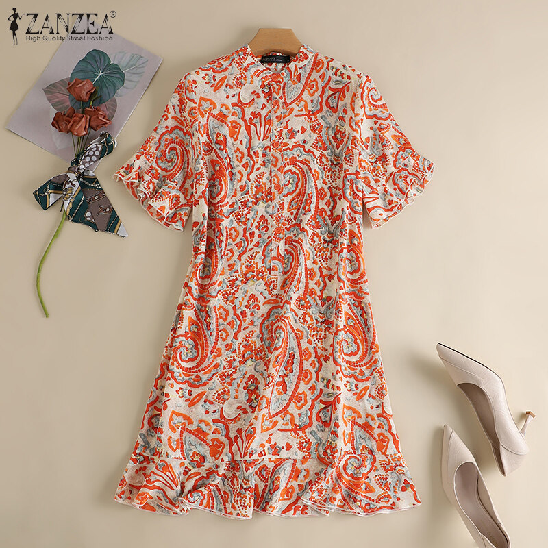 ZANZEA Women Button Down O Neck Dress Ruffle Short Sleeve Printed Loose Mini Dresses