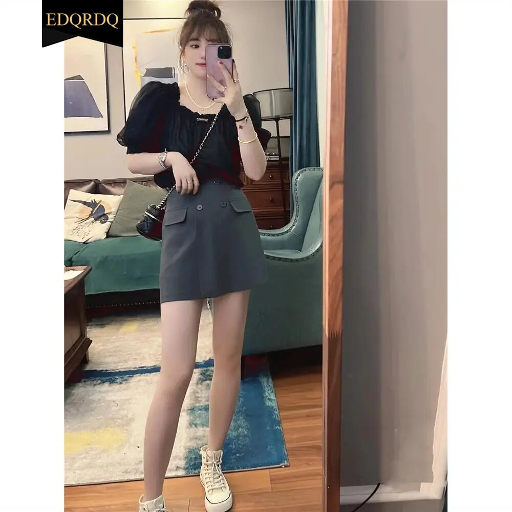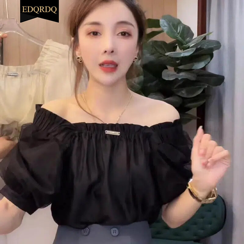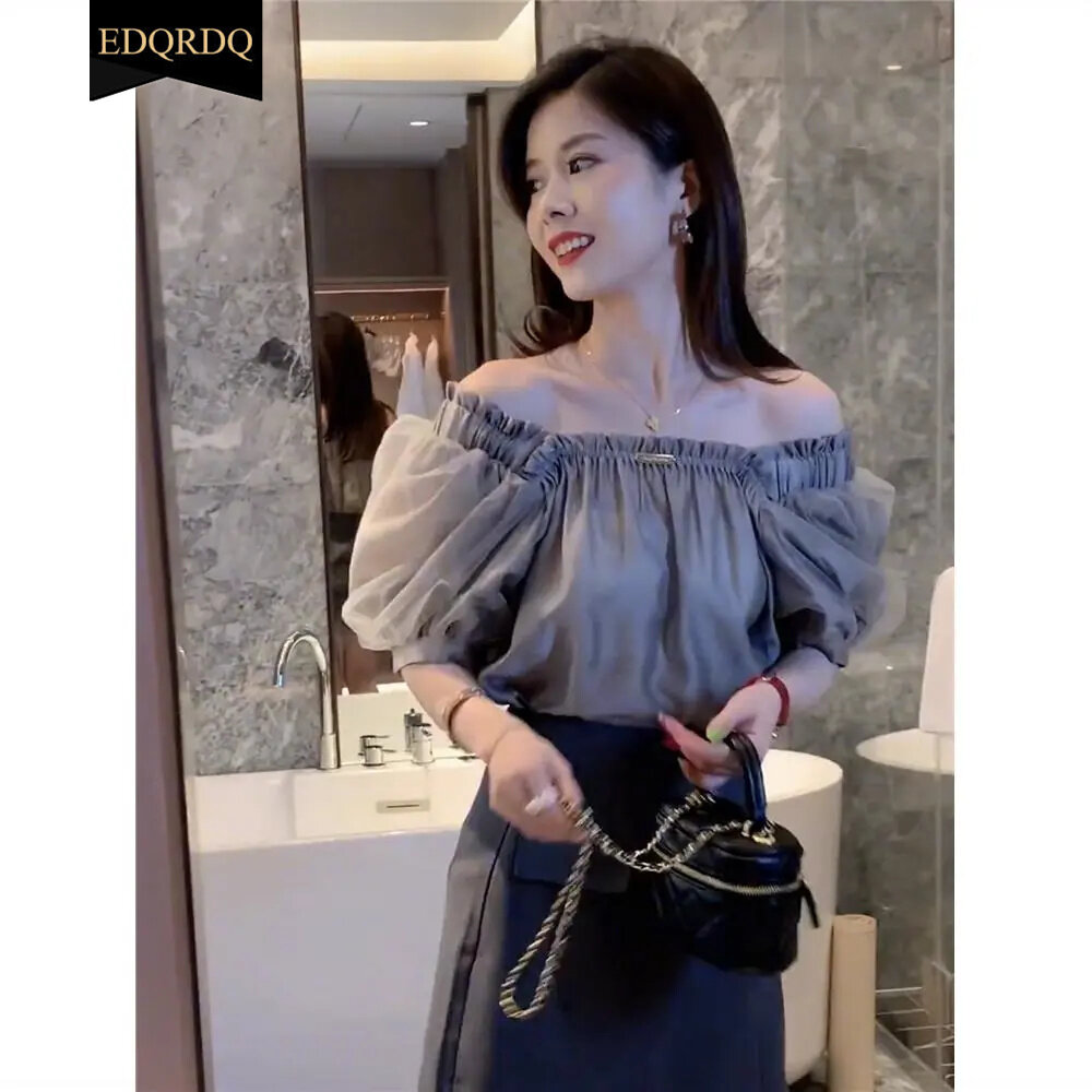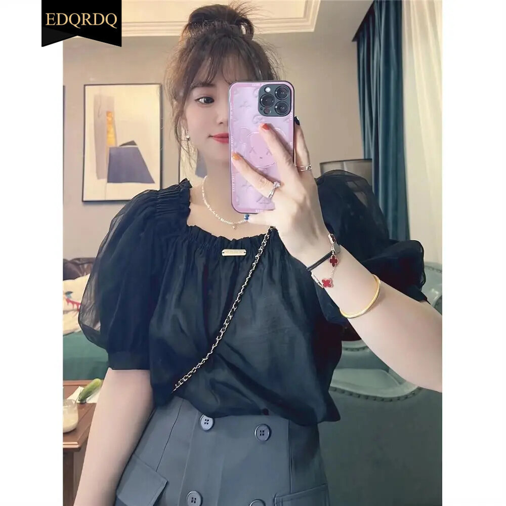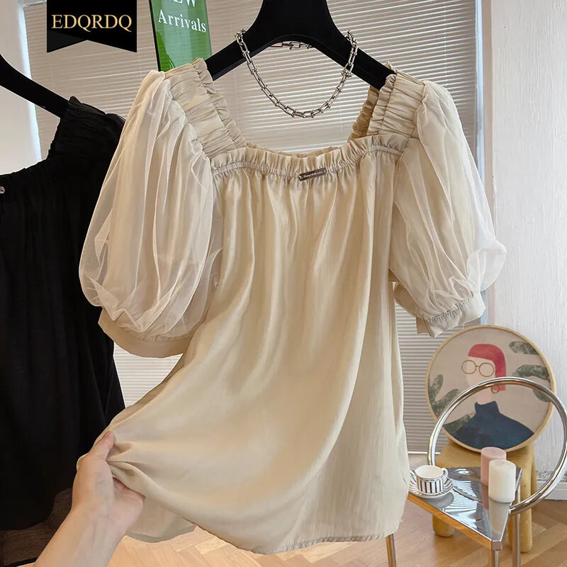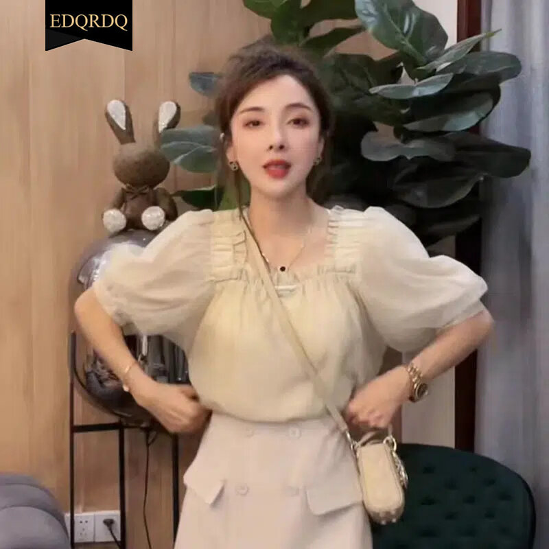 EDQRDQ Women's Mesh Sheer Ruched Tops Square Neck Puff Short Sleeve Off Shoulder Ruffle Volume Blouse Shirt