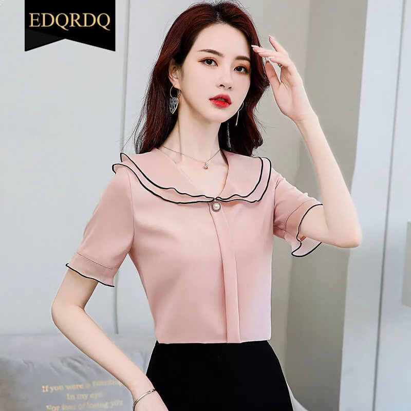 EDQRDQ Women's Doll Collar Puffy Sleeve Solid Color Chiffon Tops Short Sleeves Ruffle Blouse