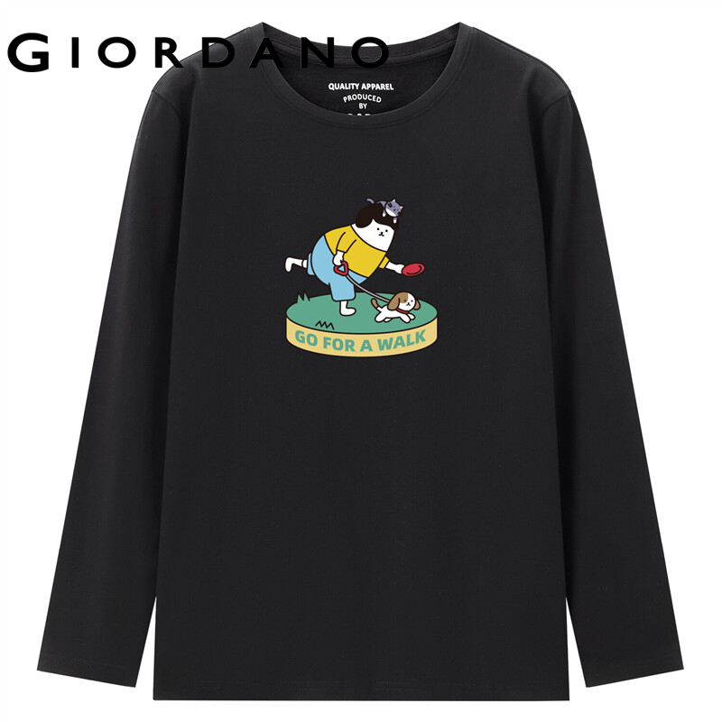 GIORDANO Women WHIKO Series T-Shirts Cute Print Long Sleeve Casual T-Shirts 100% Cotton Crewneck Simple Relaxed Tee 99392149