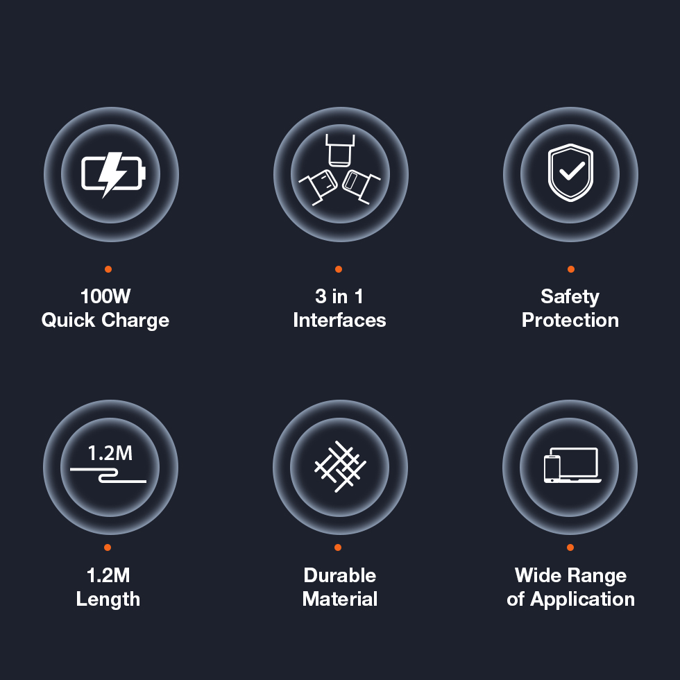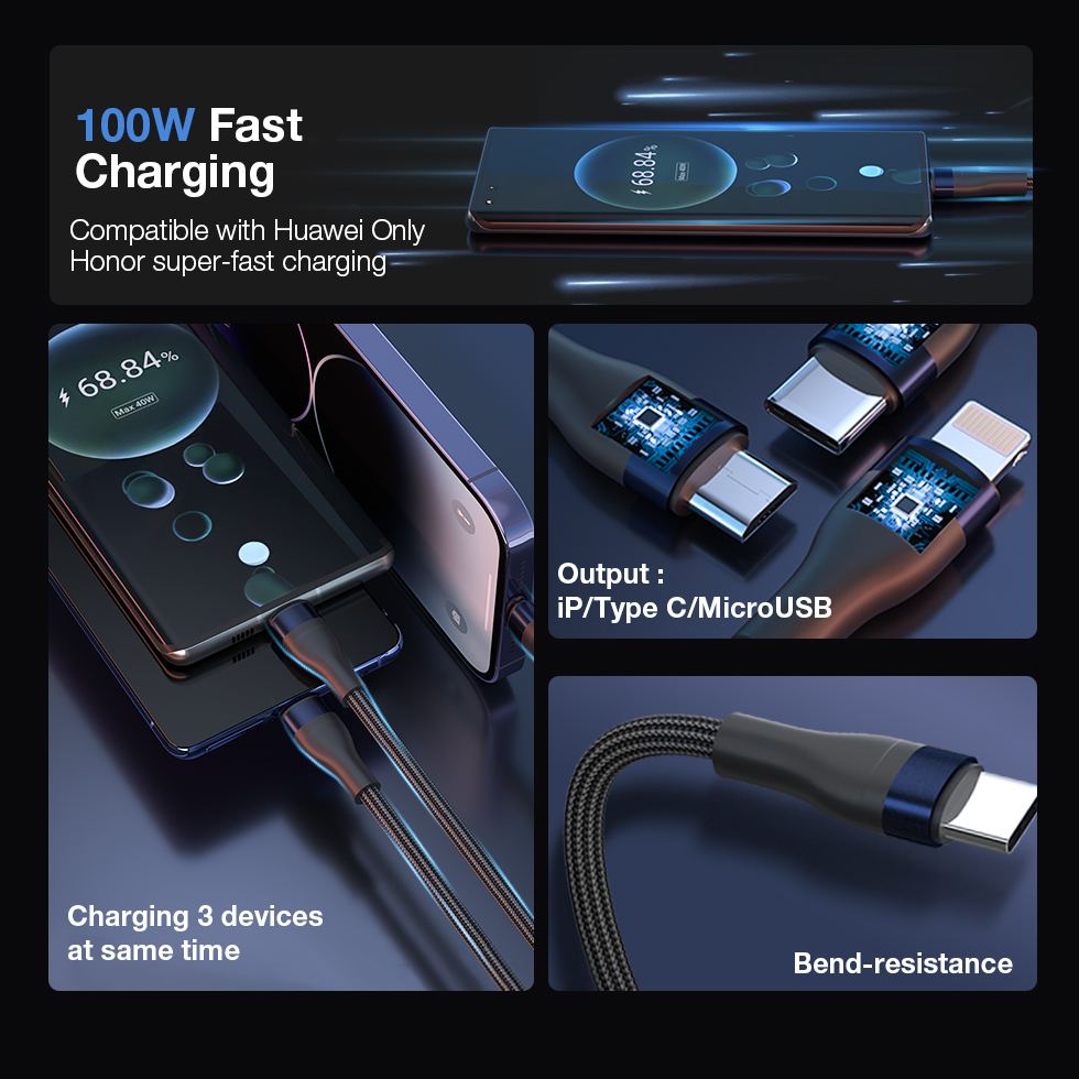 GXM 100W 3 in 1 Quick Fast Charging Data Cable iP Lightning USB Type C to Type C MicroUSB Data Transfer Samsung Huawei OPPO VIVO Xiaomi Charger Cable 1.2m Black