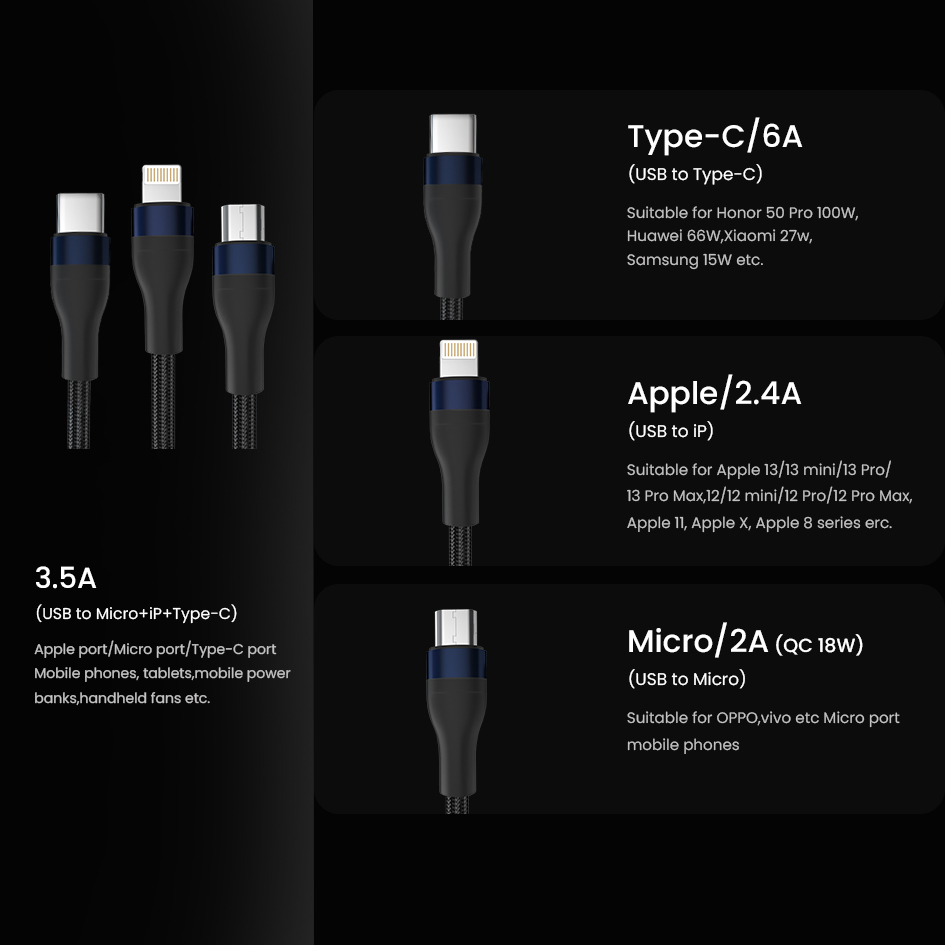 • Triple Simultaneous Charging Cable (Micro USB, iP and Type-C)