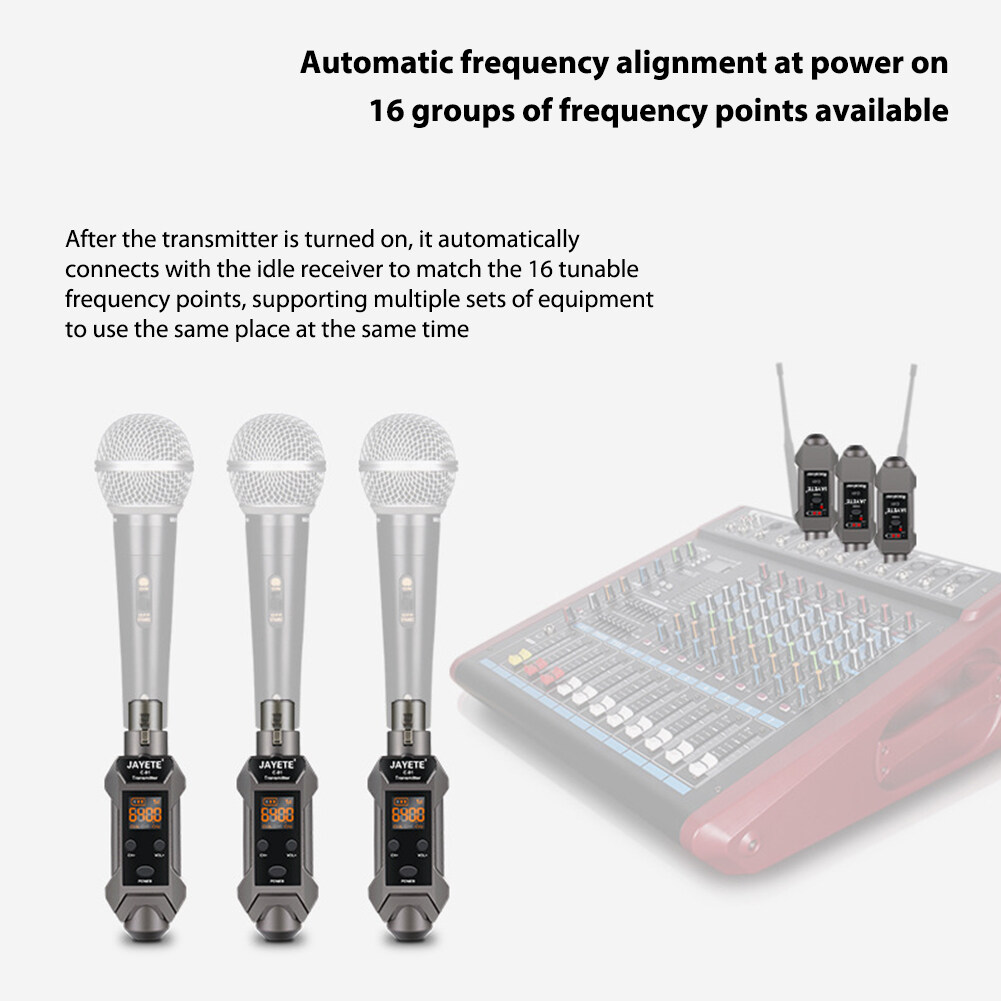 5. Automatic frequency pairing when power on, 16 groups of frequency points are available. After the transmitter is turned on, it will automatically match with the idle receiver to connect 16 adjustable frequency points, supporting multiple sets of equipment to be used at the same time.