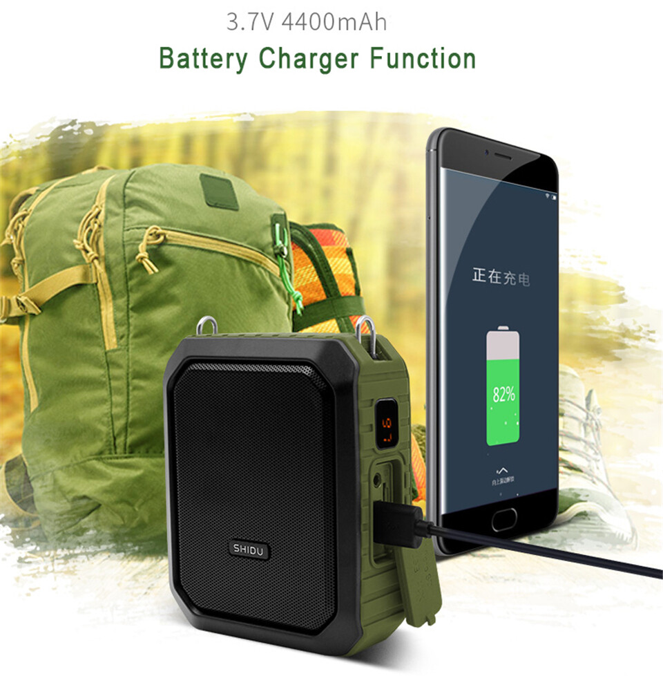 1. The New Born Waterproof Megaphone;2. Power Display Shows Present Electricty Percent;3. Bluetooth 4.2 Chip, Singnal Transmission More Fast And Stable;4. Mobile Charger/ Power Bank Function;5. Dual Voice Coil Speaker, Maximum Peak Up To 18W;6. IPX 5 Waterproof7. Two-Color Injection Molding, More Good Hand Feeling8. Super MP3 Audio Encoding Technology --- Support TF Card & U Flash Disk;9. Support AUX --- Can Connect With PC And Work As Speaker;
