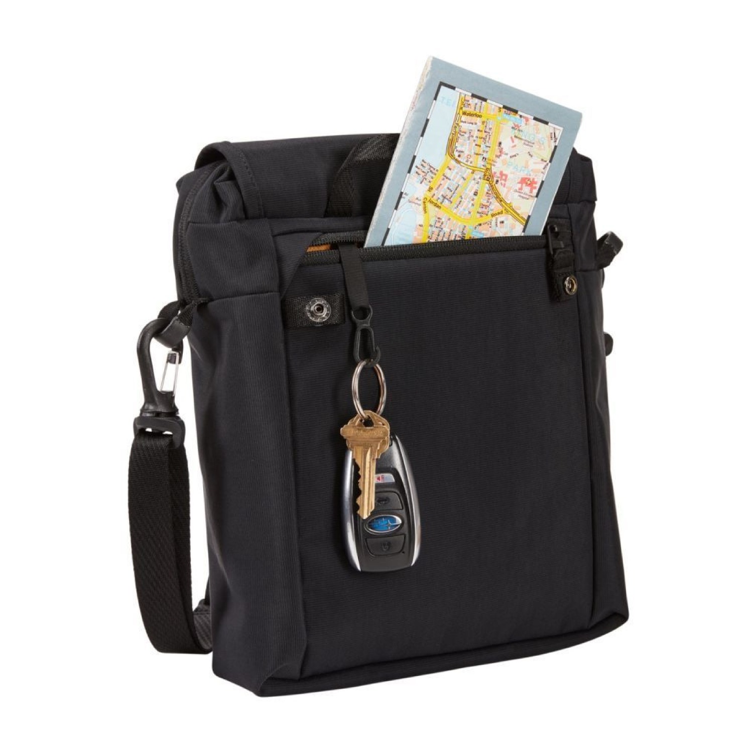 Protect a tablet up to 10.5" in the padded main compartment Magnetic flap closure provides added security to the main compartment and the small quick-access pocket Store small accessories in multiple organization pockets Store keys or a phone in the zippered back pocket with secure snap closure Carry in comfort with the removable, adjustable shoulder strap and top gab handle Designed with durable 420D nylon material with a water-resistant finish, YKK zippers, and reflective details