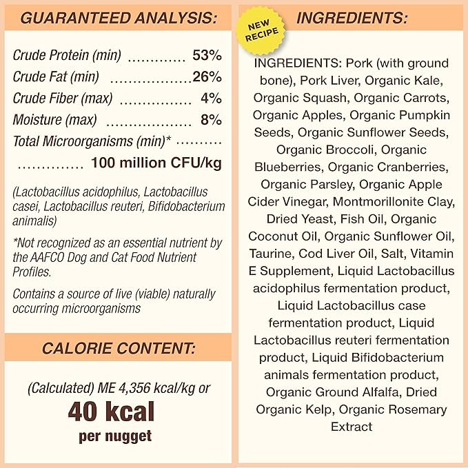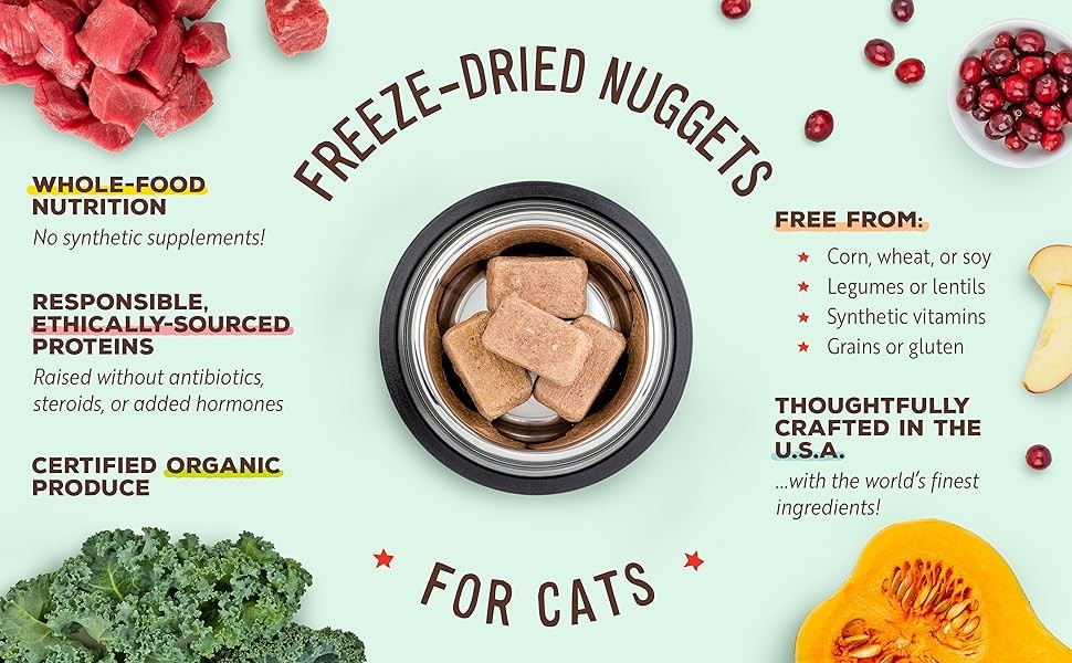 - Premium freeze-dried raw cat food made with crate-free pork raised without antibiotics, steroids or added hormones and with USDA certified organic fruits and vegetables. Grain free